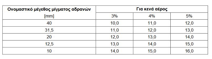 για όλες τις περιπτώσεις, καθορίζονται ανάλογα με το ονομαστικό μέγεθος μίγματος αδρανών,